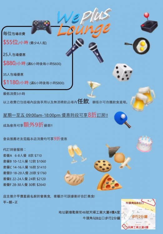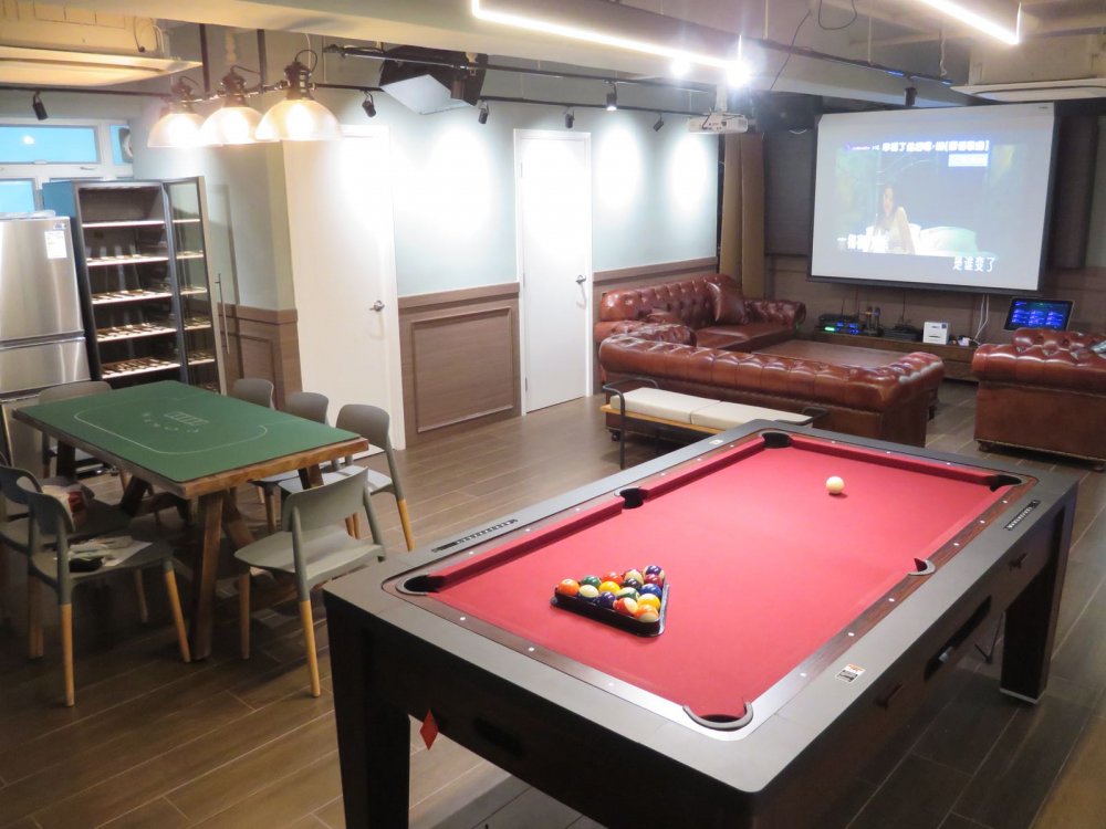 Silent environment with an open-kitchen and cooking facilities. Just spend 2 mins to walk from Ngau Tau Kok MTR Station. 24 hours operation and well equipped with sound system, 100" inch of big screen for live soccer, VR game, Karaoke, Board game, etc., Also you can chat with friends in the outdoor terrace to enjoy the great gathering moment.